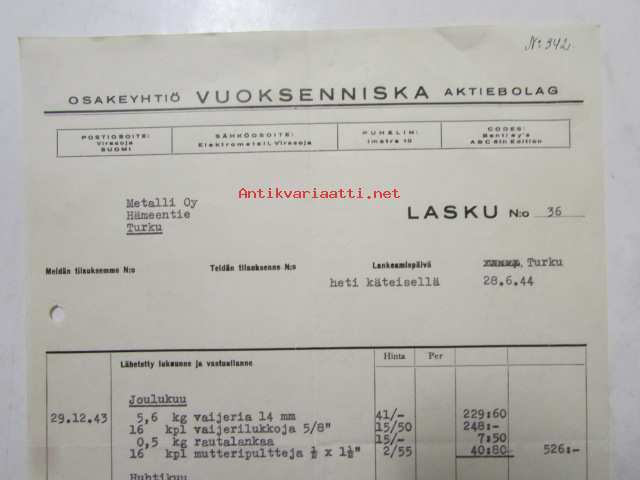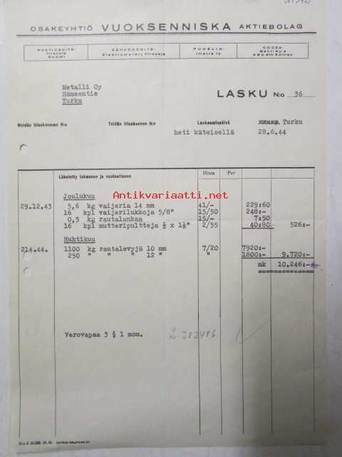 Osakeyhtiö Vuoksenniska Aktiebolag, Turku 28.6.44 - asiakirja