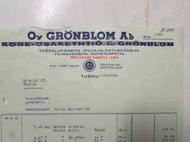Oy Grönholm Ab, Turku 2/6. 1944 - asiakirja
