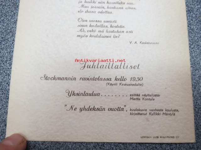 | Saatavilla | 1 kpl | | Julkaisuvuosi | 1957 | | Sivuja | 4 | | Kunto | K3 | | Sidonta/painoasu | Pienpainate | | Kielet | Suomi |