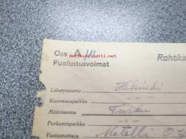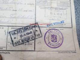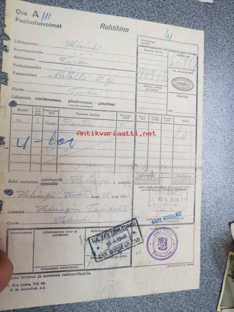 Puolustusvoimat Helsinki-Turku Metalli Oy -rautatierahtikirja 10.4.1946 Aseman virkailijan nimileima Arvi Nuoramo
