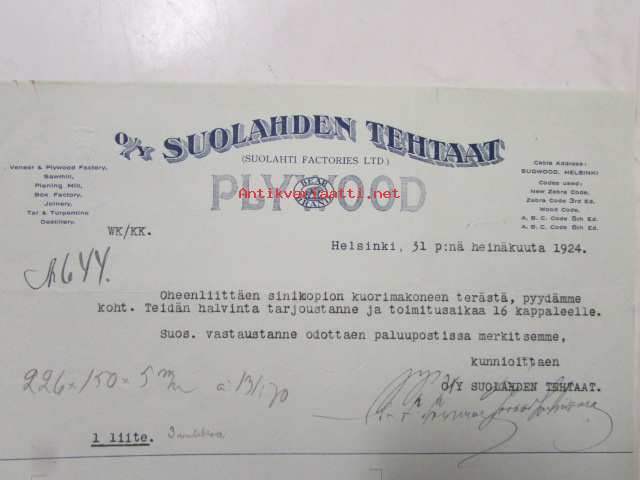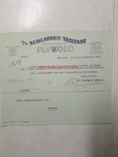 O/Y Suolahden Tehtaat, Helsinki heinäkuun 31. 1924. -asiakirja