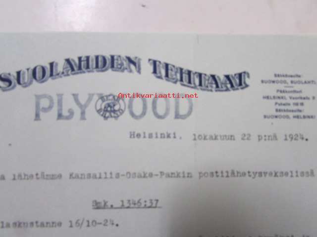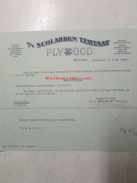 O/Y Suolahden Tehtaat, Helsinki lokakuun 22. 1924. -asiakirja