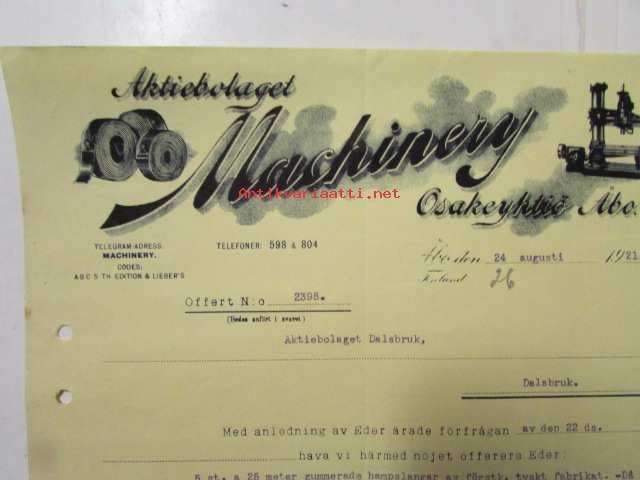 Aktiebolaget Machinery Osakeyhtiö, Åbo 21. augusti 1921. -asiakirja