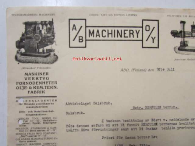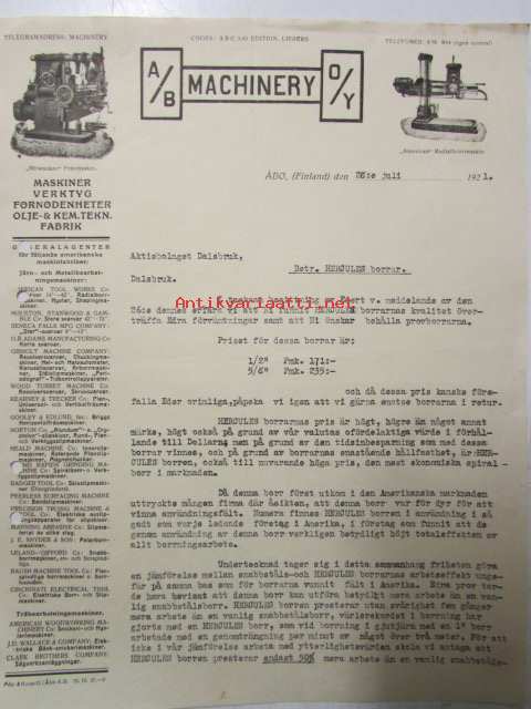 A/B Machinery O/Y, Åbo 28. juli 1921. -asiakirja