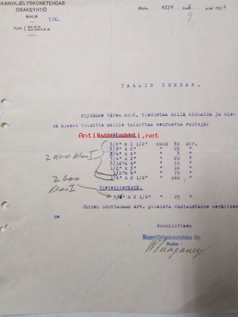 Maanviljelyskonetehdas Osakeyhtiö, Malm, syyskuun 2. 1921 -asiakirja