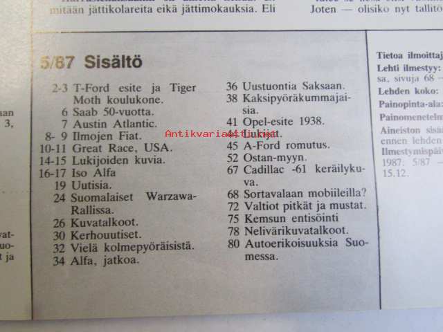 Mobilisti 1987 nr 5 -Lehti vanhojen autojen harrastajille, sisällysluettelo löytyy kuvista.