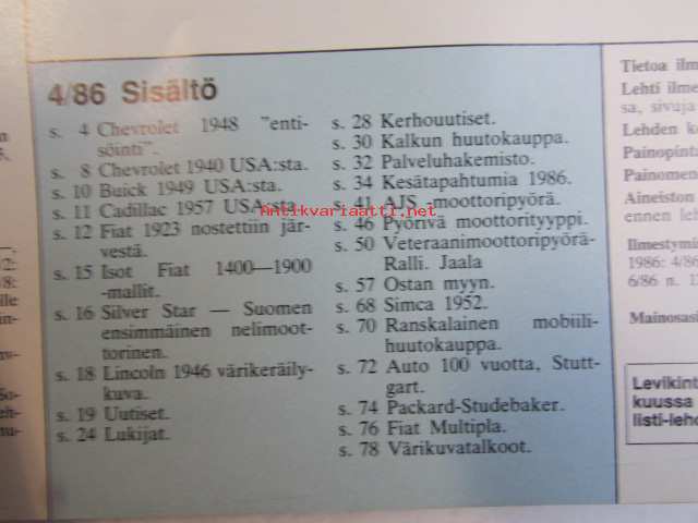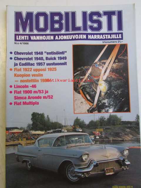 Mobilisti 1986 nr 4 -Lehti vanhojen autojen harrastajille, sisällysluettelo löytyy kuvista. Chevrolet 1948 ”entisöinti”