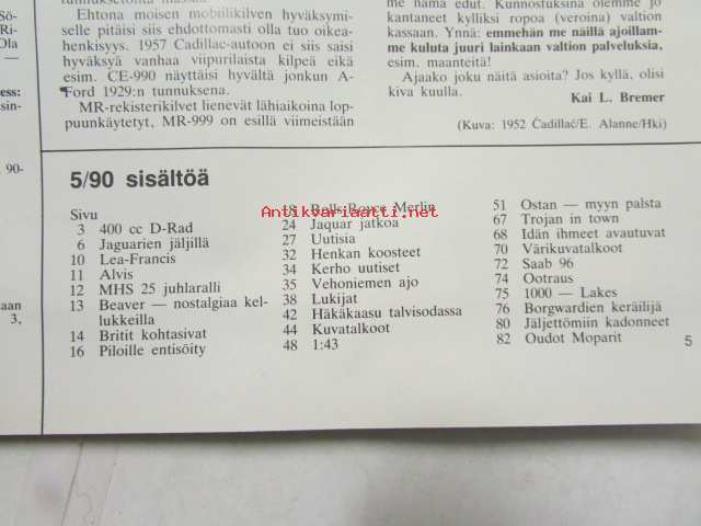 Mobilisti 1990 nr 5 -Lehti vanhojen autojen harrastajille, sisällysluettelo löytyy kuvista.