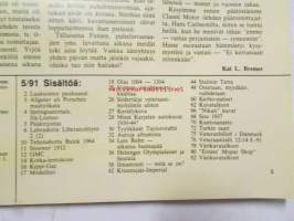 Mobilisti 1991 nr 5 -Lehti vanhojen autojen harrastajille, sisällysluettelo löytyy kuvista.