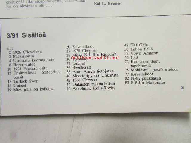 Mobilisti 1991 nr 3 -Lehti vanhojen autojen harrastajille, sisällysluettelo löytyy kuvista.