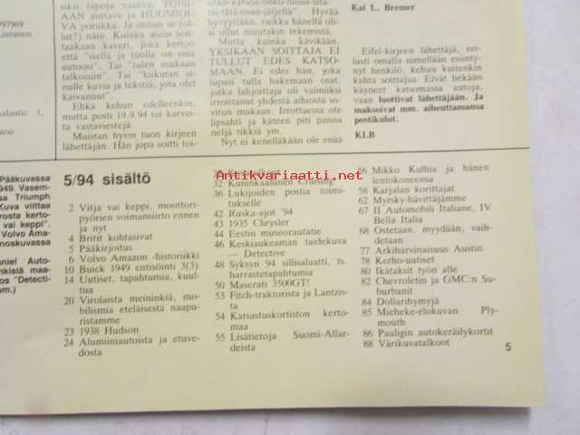 Mobilisti 1994 nr 5 -Lehti vanhojen autojen harrastajille, sisällysluettelo löytyy kuvista.