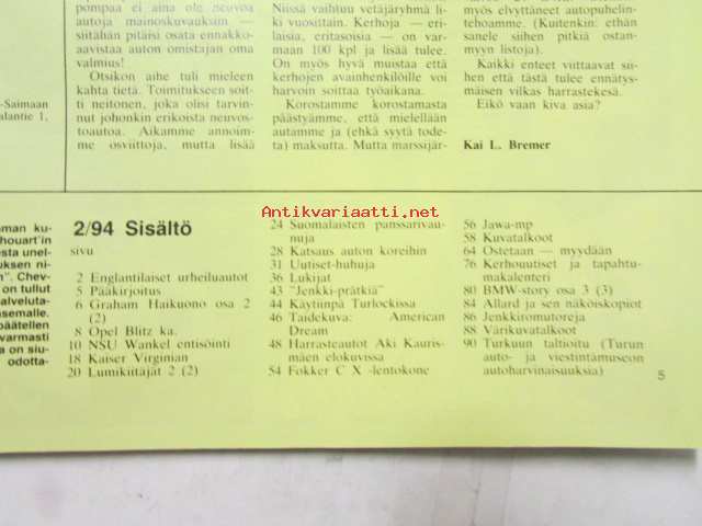 Mobilisti 1994 nr 2 -Lehti vanhojen autojen harrastajille, sisällysluettelo löytyy kuvista.