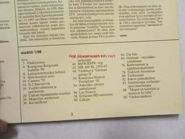 Mobilisti 1998 nr 1 -Lehti vanhojen autojen harrastajille, sisällysluettelo löytyy kuvista.