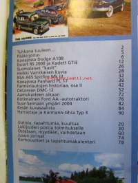 Mobilisti 2004 nr 4 -Lehti vanhojen autojen harrastajille, sisällysluettelo löytyy kuvista. Koeajossa Dodge A108 Custom Sportsman 1967, Panhard PL 17 Berline 1960
