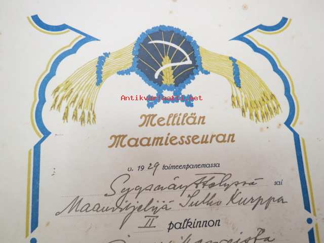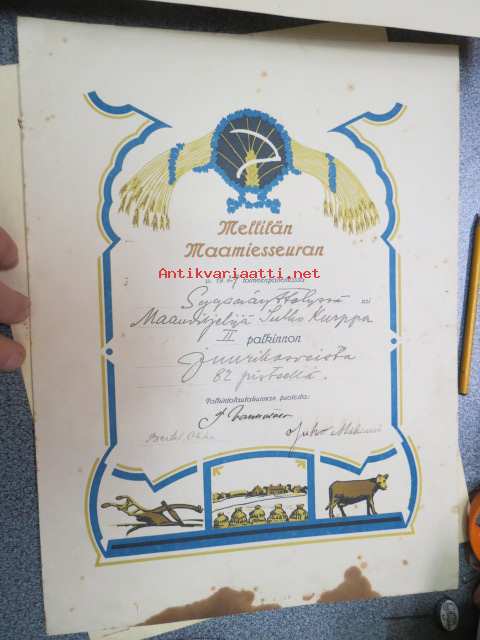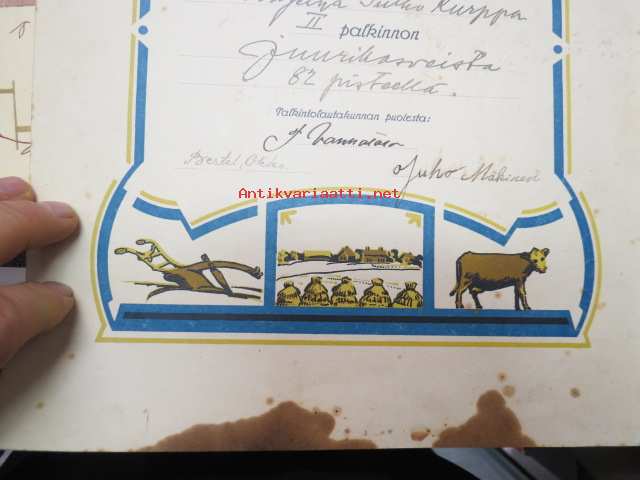 Mellilän Maamiesseura Kunniakirja / II palkinto Sulho Peltokurpalle juurikasveista