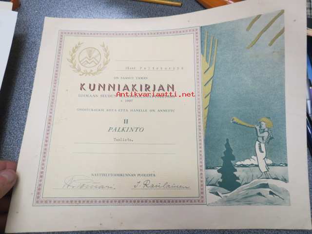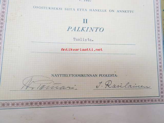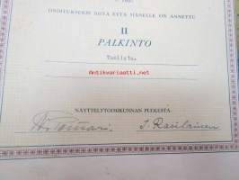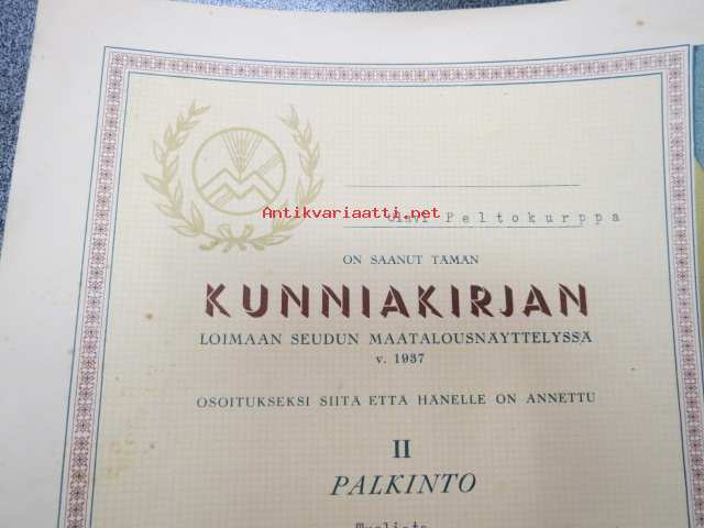 Loimaan seudun maatalousnäyttely v. 1937 Kunniakirja / II palkinto Olavi Peltokurppa tuolista
