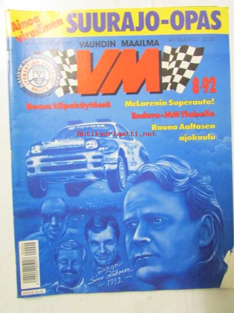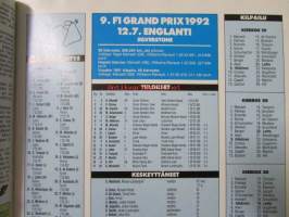 Vauhdin Maailma 1992 nr 8 -mm. Ralli-MM Uusi-Seelanti ja Argentiina, Formula 1 Englanti Ranska ja Saksa, Rauno Aaltosen ajokuolu, Alastaron Nitro-drag, Motofoto, Suzuki 125, Saab-Formula, Mitsubishi Colt, Formula veneet, Formula k, Rata-SM ALastaro, Bensa kisakäytössä tehoa ja ajettavuutta, Junnu-SM kiuruvesi, Enduro-MM Tintille kulta, Jyväskylän Suurajo-opas21 x 29 cm.