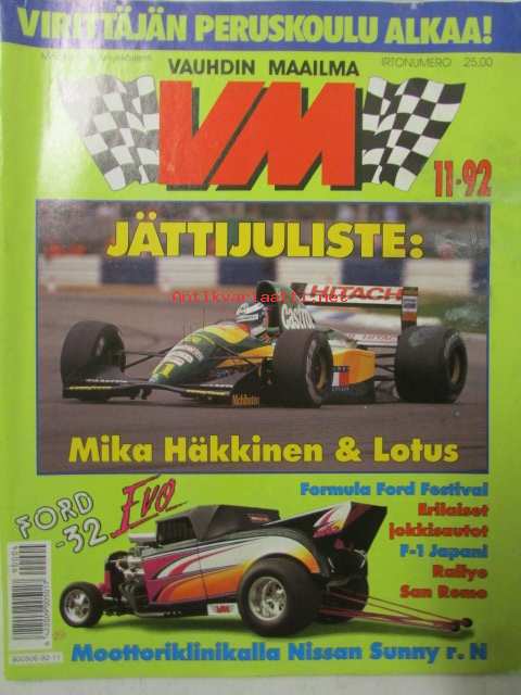Vauhdin Maailma 1992 nr 11 -mm. Formula 1 Japani, Nissan GTi ryhmä N, Löytyykö Kuplalle haastajaa, Ralli-MM San Remo, Renault Clio S, Evo -32, Kuukauden Profiili Tomi Laine Mies jota ei vauhti hirvitä, VM esittelee Yamaha 250, Timo Koskisen Arvokkaat 60-luvun Rallipelit, Ruotsin Katuautofinaalit, Formula Ford Festival, Antti Luodin Jet Ski ja pirun hauskaa puuhaa vaikka märkää, Ralli-MM San Remo, Junnu-SM Jurva, Ralli -SM Teboil, Joggisliiga finaali.21 x 29 cm.