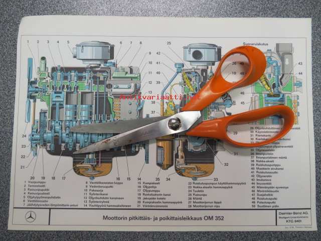 Mercedes-Benz Moottorin pitkittäis- ja poikittaisleikkaus OM 352 -tehtaan havaintokuva asentajakolutukseen