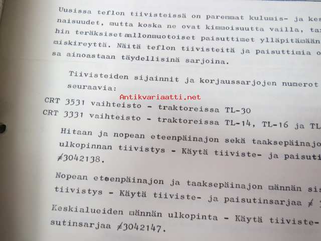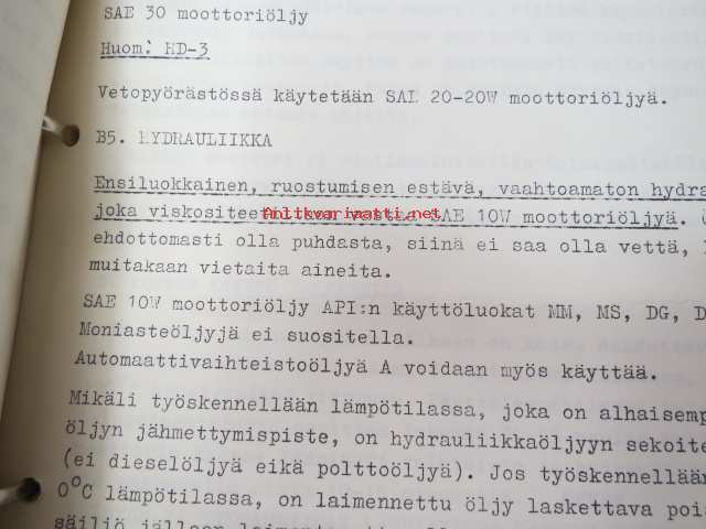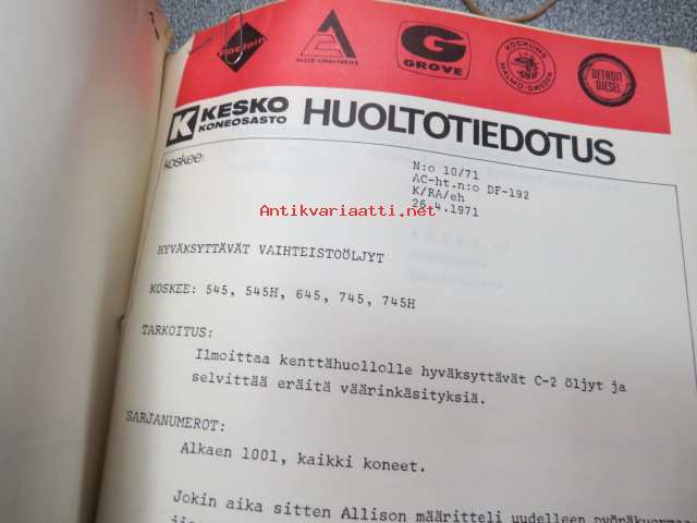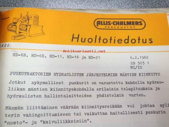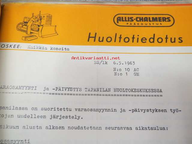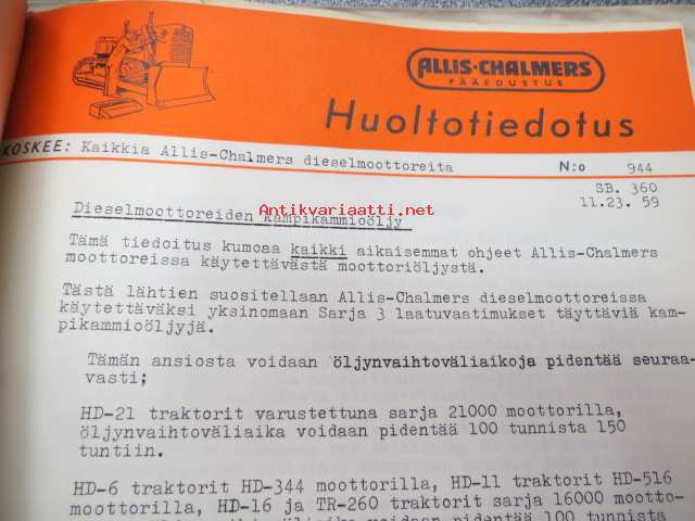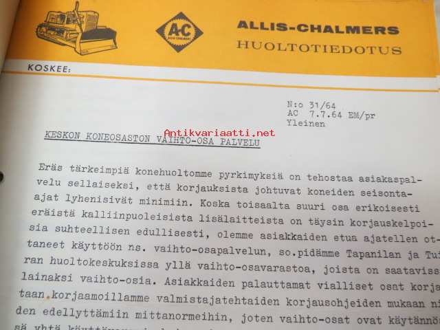 Allic-Chalmers huoltotiedotukset -kansiollinen huoltotiedotuksia 1959-1970