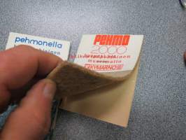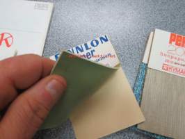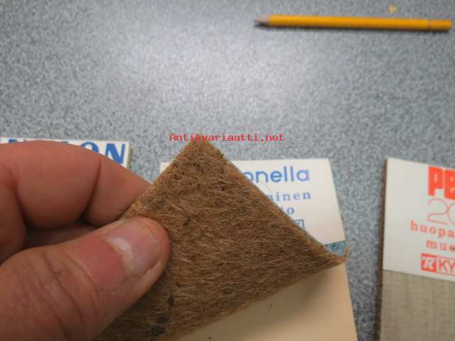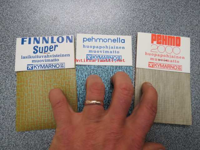 Pehmo 2000 huopapohjainen muovimatto, Pehmonella, huopapohjainen muovimatto, Finnlon Super lasikuituvahvisteinen muovimatto - mallipalat, takana esittelytekstit