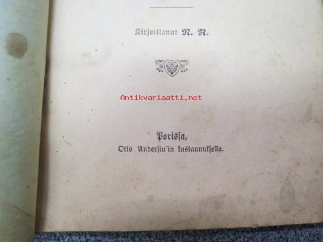 | Saatavilla | 1 kpl | | Julkaisuvuosi | 1902 | | Sivuja | 40 | | Painos | 1. | | Kunto | K2 | | Sidonta/painoasu | Nidottu (pehmeäk.) | | Kielet | Suomi |