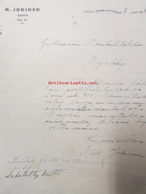 N. Jokinen Lavia, Lavia marraskuun 8. 1938 -asiakirja