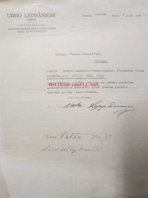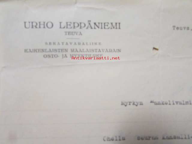 Urho Leppäniemi Sekatavaraliike Teuva, Teuva marraskuun 2. 1939 -asiakirja