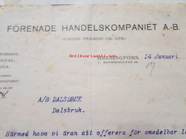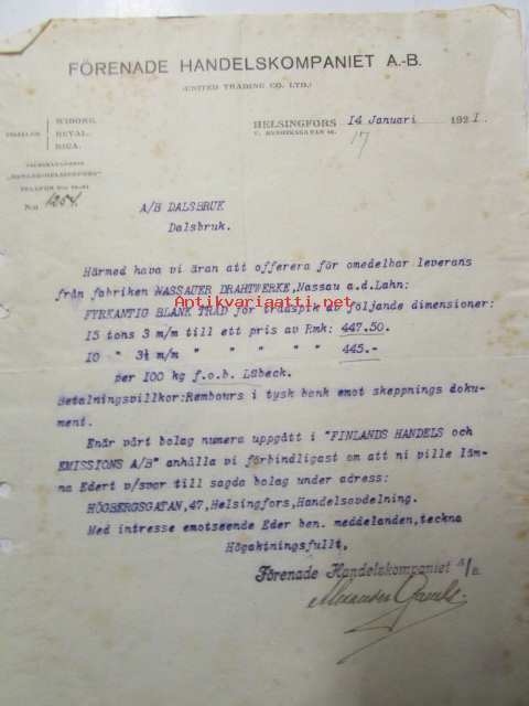 Förenade Handelskompaniet A.-B. Helsingfors, Helsingfors 14. januari 1921. -asiakirja