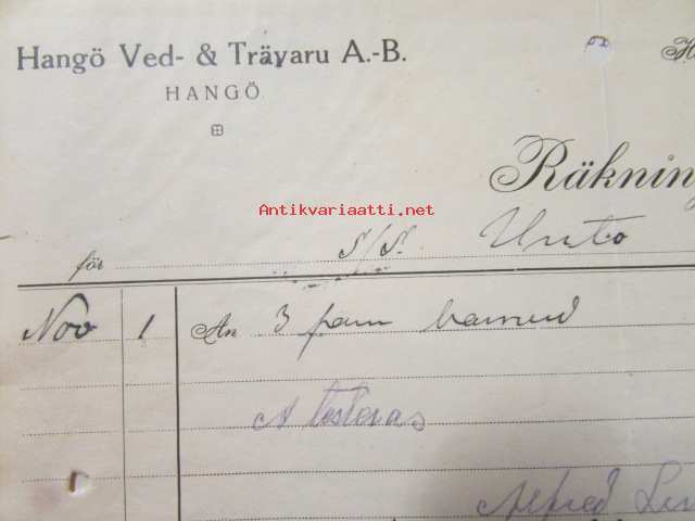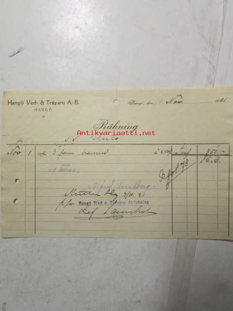 Hangö Ved- & Träyaru A.-B. Hangö 1. november 1921. -asiakirja