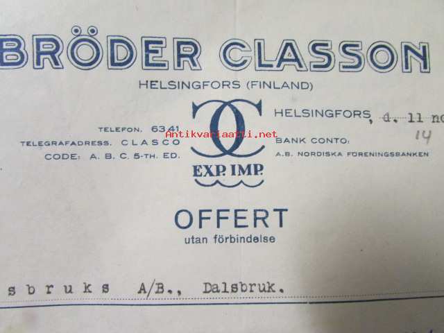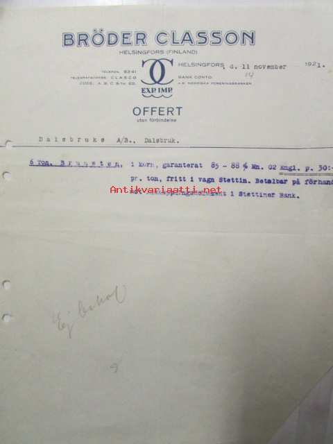 Bröder Classon, Helsingfors 11. november 1921. -asiakirja
