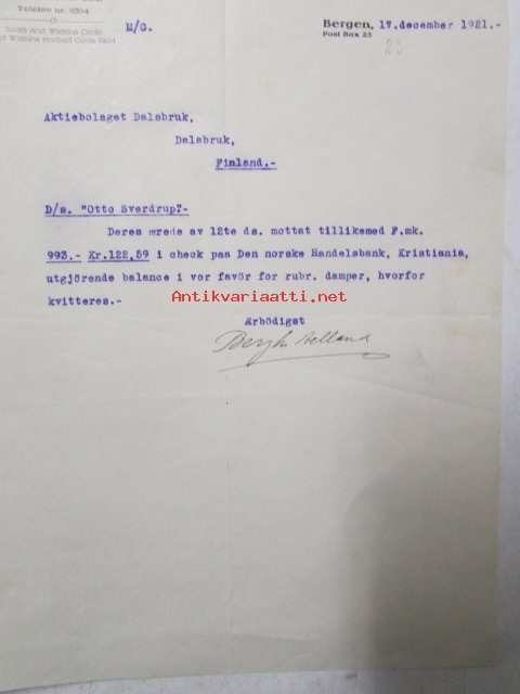 Bergh & Helland, Bergen 17. december 1921. -asiakirja