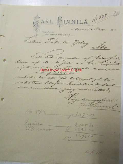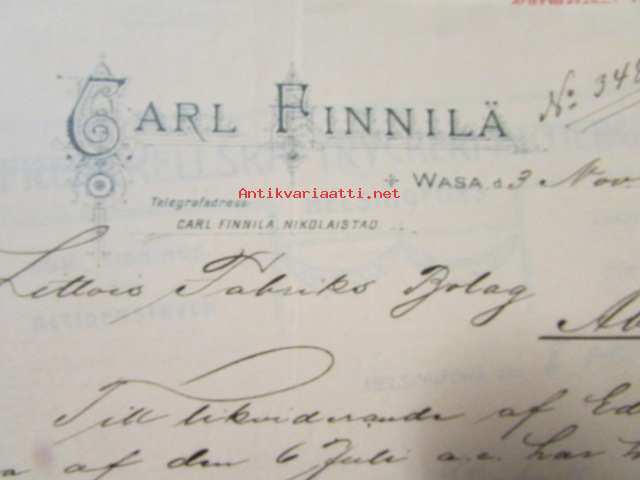 Carl Finnilä, Wasa 3. november 1891. -asiakirja