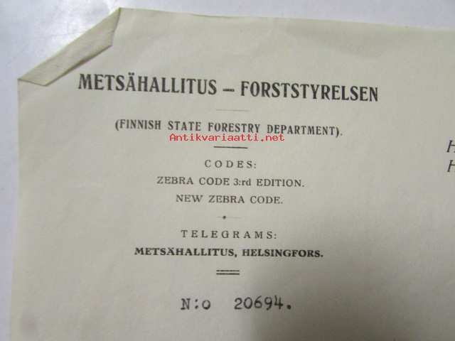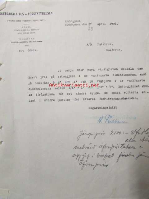 Metsähallitus - Forststyrelsen Helsingissä 27. april 1921. -asiakirja