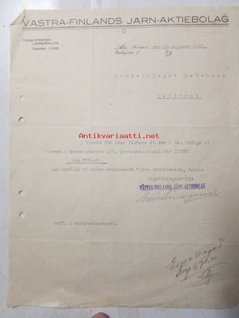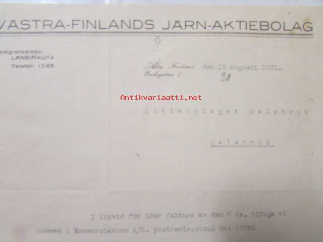 Västra-Finlands Järn-Aktiebolaget, Åbo 18 augusti 1921 -asiakirja
