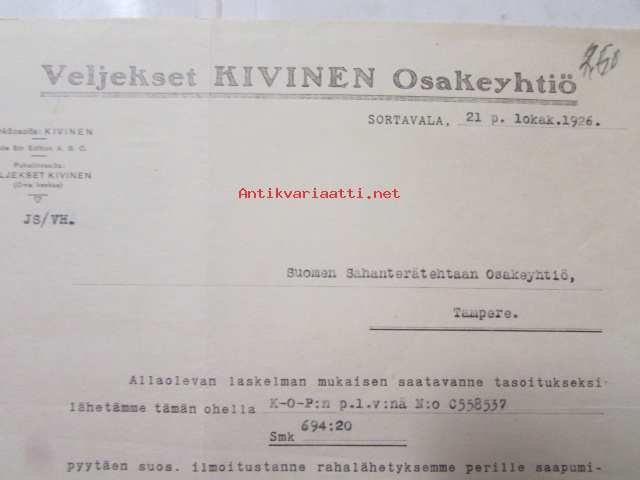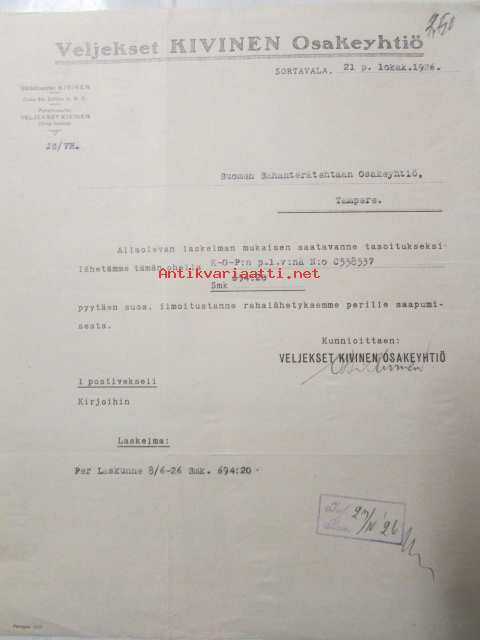 Veljekset Kivinen Osakeyhtiö, Sortavala 21. lokakuuta 1926 -asiakirja