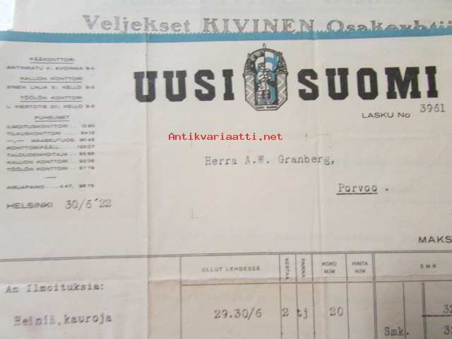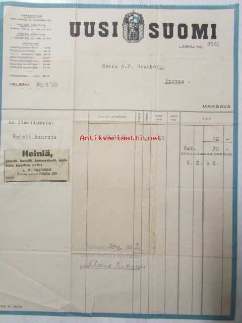 Uusi Suomi, Helsinki 30/6 1922. -asiakirja