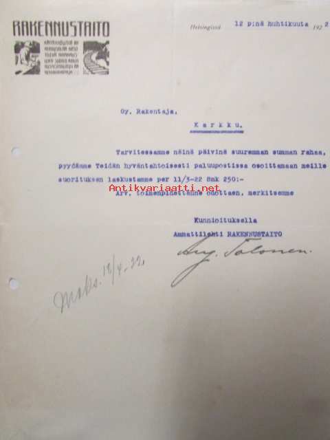 Rakennustaito, Helsingissä 12. huhtikuuta 1922. -asiakirja