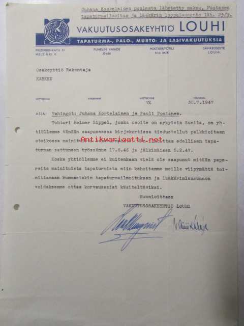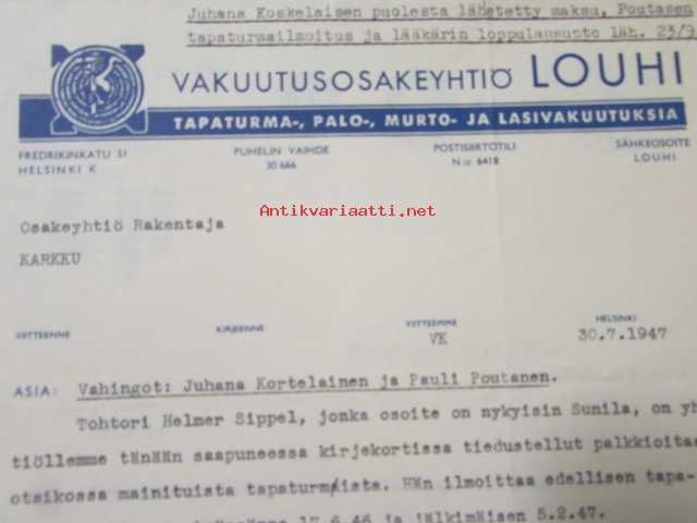 Vakuutusosakeyhtiö louhi, Helsinki 30.7. 1947. -Vanhinkokorvaus asiakirja