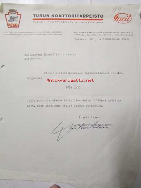 Turun Konttoritarpeisto Turussa 10. tammikuuta 1940. -asiakirja