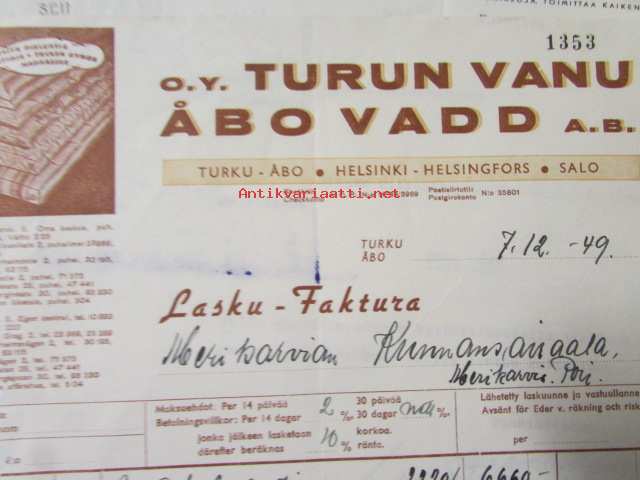 O.Y. Turun Vanu Åbo Vadd A.B. Turussa 7.12. 1949. -asiakirja