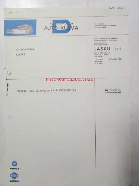 Autokeskus Oy Auto-Kulma, Tampere 21.12. 1968. -asiakirja