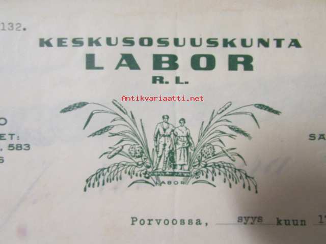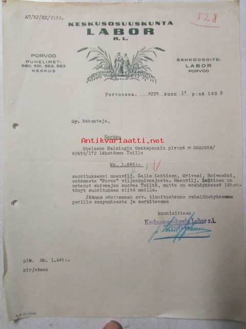 Keskusosuuskunta Labor r.l. Porvoossa syyskuun 17. 1938. -asiakirja