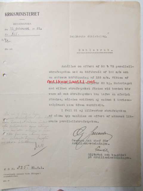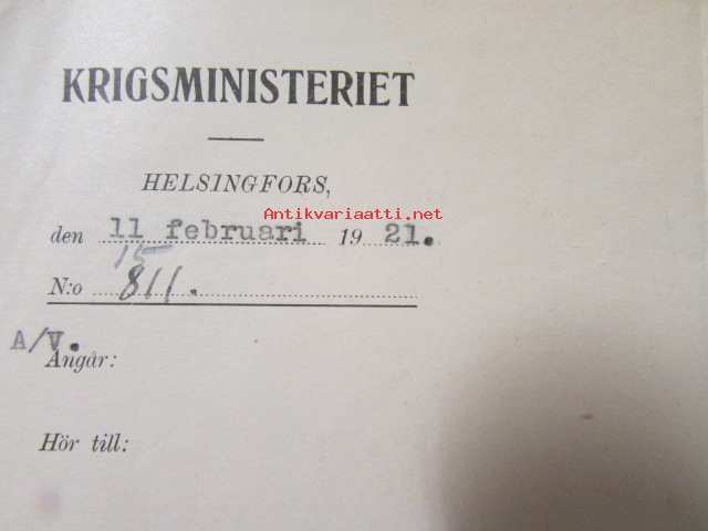 Krigsministeriet, Helsingfors 11. februari 1921. -asiakirja