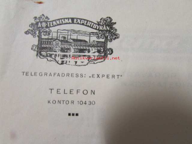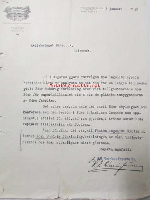 A.B Tekniska Expertbyrån, Helsingfors 7 januari 1920. -asiakirja