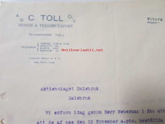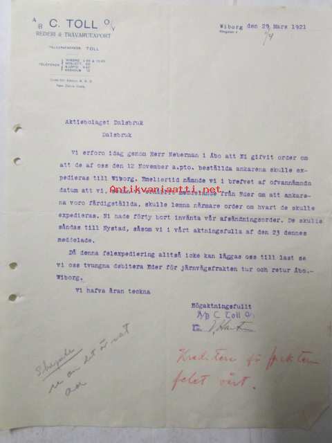 A/B C Toll O/Y Rederi & Trävaruexport, Wiborg 29 mars 1921. -asiakirja