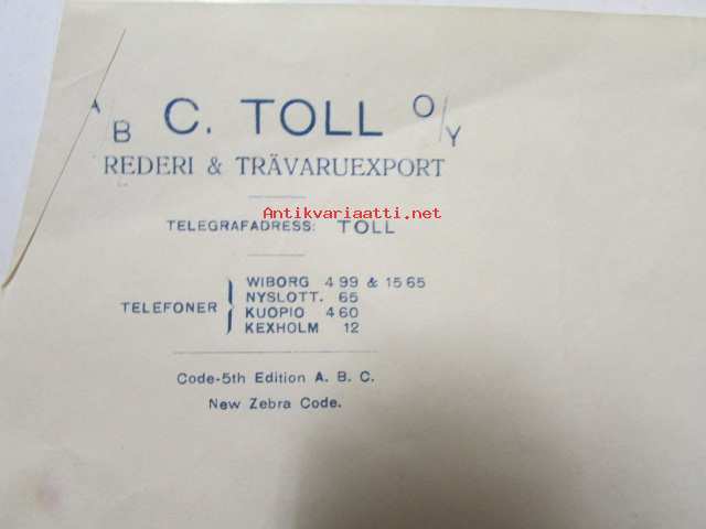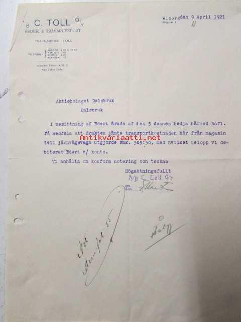 A/B C Toll O/Y Rederi & Trävaruexport, Wiborg 9 April 1921. -asiakirja