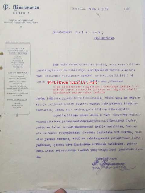 P.Kuosmanen Huttula, Huttula elokuun 1. 1921. -asiakirja