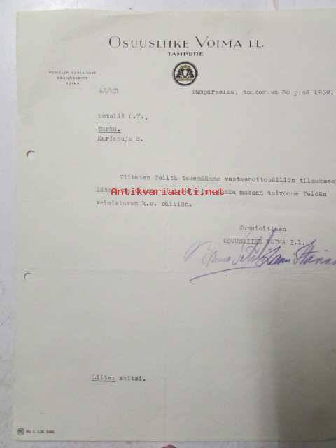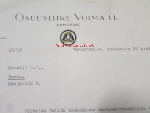 Osuusliike Voima I.L., Tampereella toukokuun 30. 1939. -asiakirja