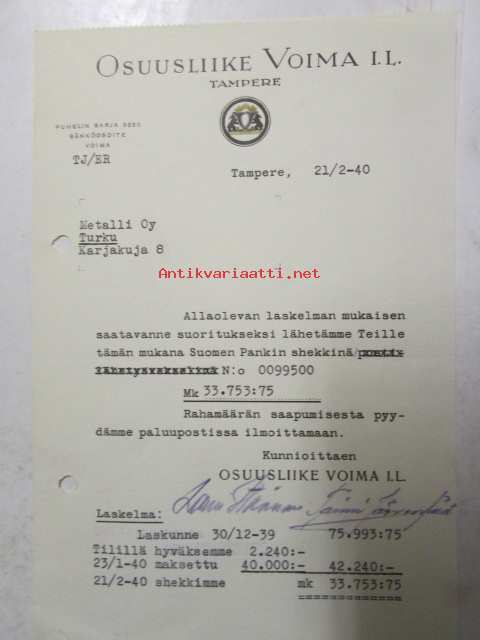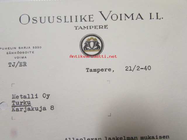 Osuusliike Voima I.L., Tampereella 21/2. 1939. -asiakirja